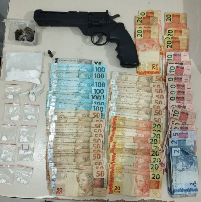 Diante da confirmação, as guarnições realizaram a abordagem no imóvel, onde foram recebidas pelo morador. Durante a busca, foram localizados 34 gramas de cocaína, parte fracionada em nove porções embaladas individualmente e o restante em um único pacote — quantidade suficiente para preparar cerca de 30 novas porções para comercialização. Também foram apreendidos R$ 2.475,00 em espécie, munição, simulacro de revólver e uma grande quantidade de objetos de procedência duvidosa, supostamente trocados por drogas.