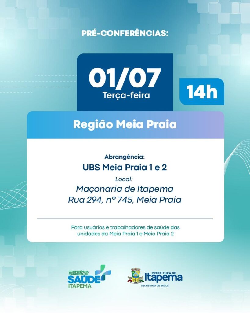 A Secretaria de Saúde de Itapema, em parceria com o Conselho Municipal de Saúde, convida a comunidade da Meia Praia para participar da próxima pré-conferência regional, que acontece nesta terça-feira, dia 1º de julho, a partir das 14h, na Maçonaria de Itapema (Rua 294, nº 745 – Meia Praia).