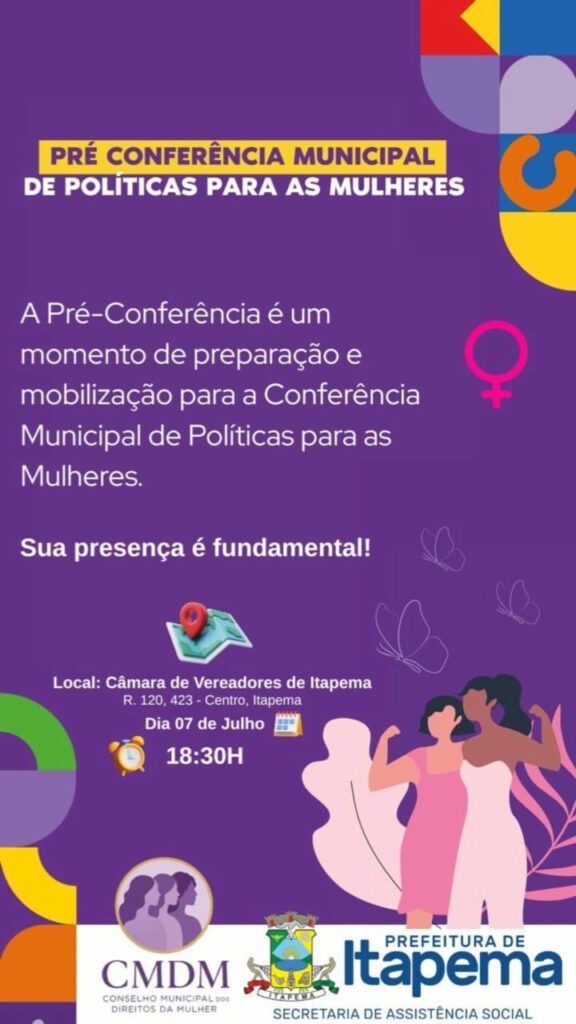 A Prefeitura de Itapema, por meio da Secretaria de Assistência Social e do Conselho Municipal dos Direitos da Mulher (CMDM), realiza na próxima segunda-feira (07) a Pré-Conferência Municipal de Políticas para as Mulheres. O encontro tem como objetivo mobilizar e preparar a sociedade para a futura Conferência Municipal, promovendo o debate e a construção coletiva de propostas voltadas aos direitos e à qualidade de vida das mulheres.