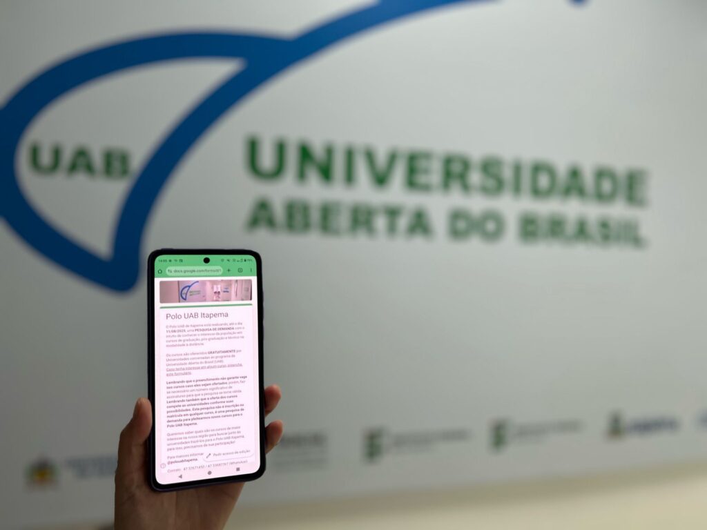 Os cursos do Polo da Universidade Aberta do Brasil (UAB) de Itapema tem uma grande procura tanto de pessoas da cidade, quanto da região. E para avançar ainda mais, foi lançada uma pesquisa pública com o objetivo de qualificar ainda mais as ações. A iniciativa tem como objetivo identificar a demanda por novos cursos de nível superior na modalidade de educação a distância (EaD), tanto de graduação quanto de pós-graduação, a serem ofertados em parceria com instituições públicas de ensino superior.