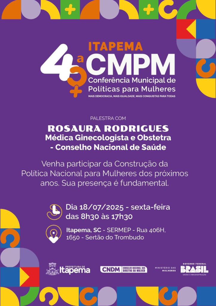 A 4ª Conferência Municipal de Políticas para Mulheres de Itapema será realizada no dia 18 de julho, das 8h30 às 17h30, no SERMEP (Rua 406H, nº 1650 – Sertão do Trombudo). O evento convida a comunidade a participar ativamente da construção de políticas públicas voltadas às mulheres, reunindo lideranças comunitárias, profissionais da rede, representantes da sociedade civil e demais interessadas.