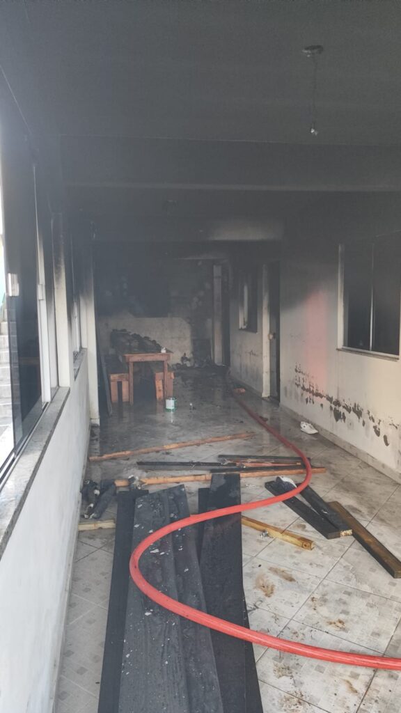 Nos fundos da edificação, os bombeiros encontraram o foco principal do incêndio, em um cômodo utilizado como lavanderia/depósito. Após a extinção, foi realizada ventilação positiva com o auxílio de motoventilador para liberar a fumaça e resfriar o ambiente, eliminando também pequenos focos de reignição.