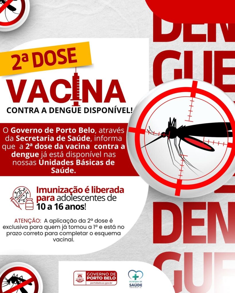 📌 A segunda dose da vacina contra a dengue está disponível para quem tomou a primeira dose, e está dentro do prazo para completar o esquema vacinal.