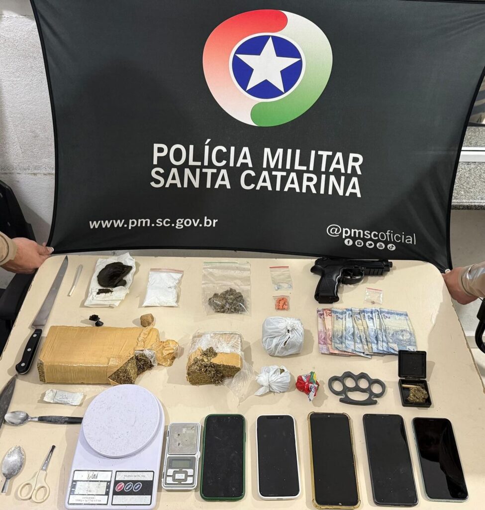 Na noite de quarta-feira (14), por volta das 22h, uma guarnição do Tático realizava patrulhamento no bairro Vila Nova, em Porto Belo, quando visualizou dois indivíduos em atitude suspeita próximos à Praça do Palco das Artes — local de grande circulação de famílias e crianças.