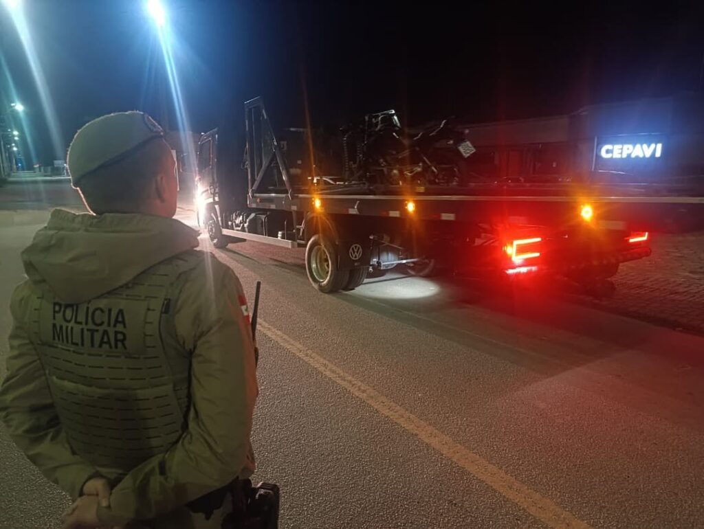 Na madrugada deste sábado (17), a Polícia Militar realizava rondas nas proximidades de uma conveniência no bairro Alto Perequê, quando motociclistas passaram a realizar manobras perigosas, como cortes de giro e empinadas.
