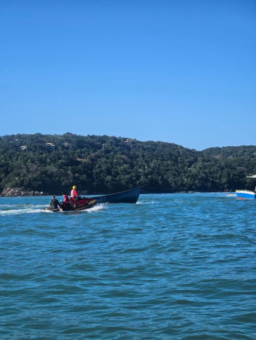 Após o resgate, os bombeiros solicitaram apoio para a retirada da embarcação, que estava parcialmente submersa, com apenas a proa aparente. A operação contou com a participação da BI-Matadeiro e de uma embarcação de médio porte que se prontificou a auxiliar. O barco foi retirado da água e levado em segurança até a baía da praia do Araçá, ficando aos cuidados do proprietário.