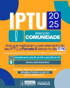Destaques Porto Belo Região Governo de Porto Belo reforça prazo para pagamento da 9ª parcela do IPTU 2025 Setembro 29, 2025