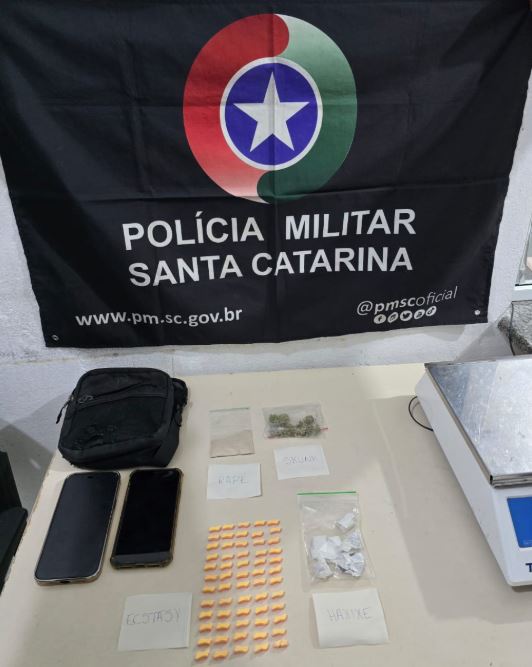 Na busca pessoal ao condutor, de 32 anos, nada de ilícito foi encontrado. Contudo, durante a revista no interior do veículo, os policiais localizaram uma bolsa preta contendo 61 comprimidos de ecstasy (27,8 g), 4,8 g de skunk, 12,8 g de haxixe, 7,6 g de rapé e dois aparelhos celulares.