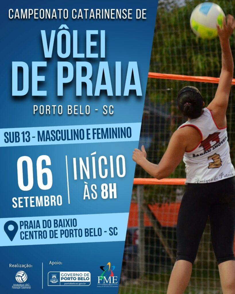 O município de Porto Belo sediará o Campeonato Catarinense de Vôlei de Praia Sub-13, nas categorias masculino e feminino. A competição acontece no dia 06 de setembro, a partir das 8h, na Praia do Baixio, localizada no Centro da cidade.