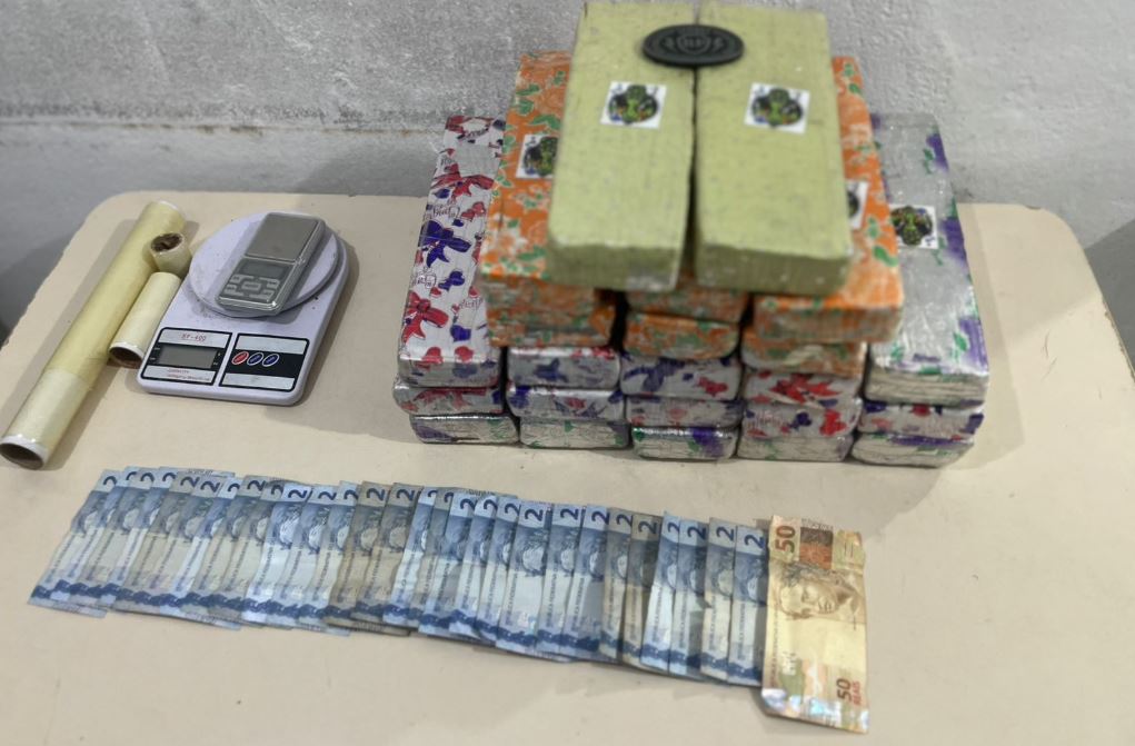 Durante as buscas na residência, a polícia apreendeu cerca de dezessete quilos e meio de maconha, cento e seis reais em dinheiro, plástico para embalar drogas, uma balança de precisão e uma pistola calibre nove milímetros com numeração suprimida.