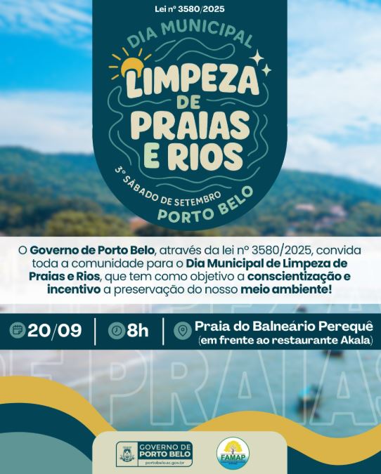 O Governo de Porto Belo, através da Fundação do Meio Ambiente (FAMAP), realizará no dia 20 de setembro, o Dia Municipal de Limpeza de Praias e Rios, instituído pela Lei Municipal nº 3580/2025.