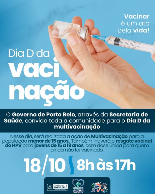 O Governo Municipal de Porto Belo, por meio da Secretaria de Saúde, promoverá no dia 18 de outubro o Dia D da Vacinação, uma ação que tem como objetivo atualizar a caderneta vacinal de crianças e adolescentes do município. A mobilização acontecerá das 8h às 17h, nas unidades básicas de saúde que contém salas de vacinação.