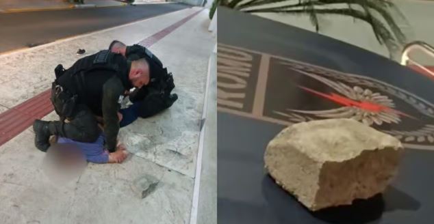 Segundo a Guarda Municipal, o homem não acatou as ordens e passou a correr de um lado para o outro. Os agentes utilizaram força física para contê-lo e retirar a lajota de sua mão. Mesmo após a imobilização, ele ainda tentava se soltar dos guardas.