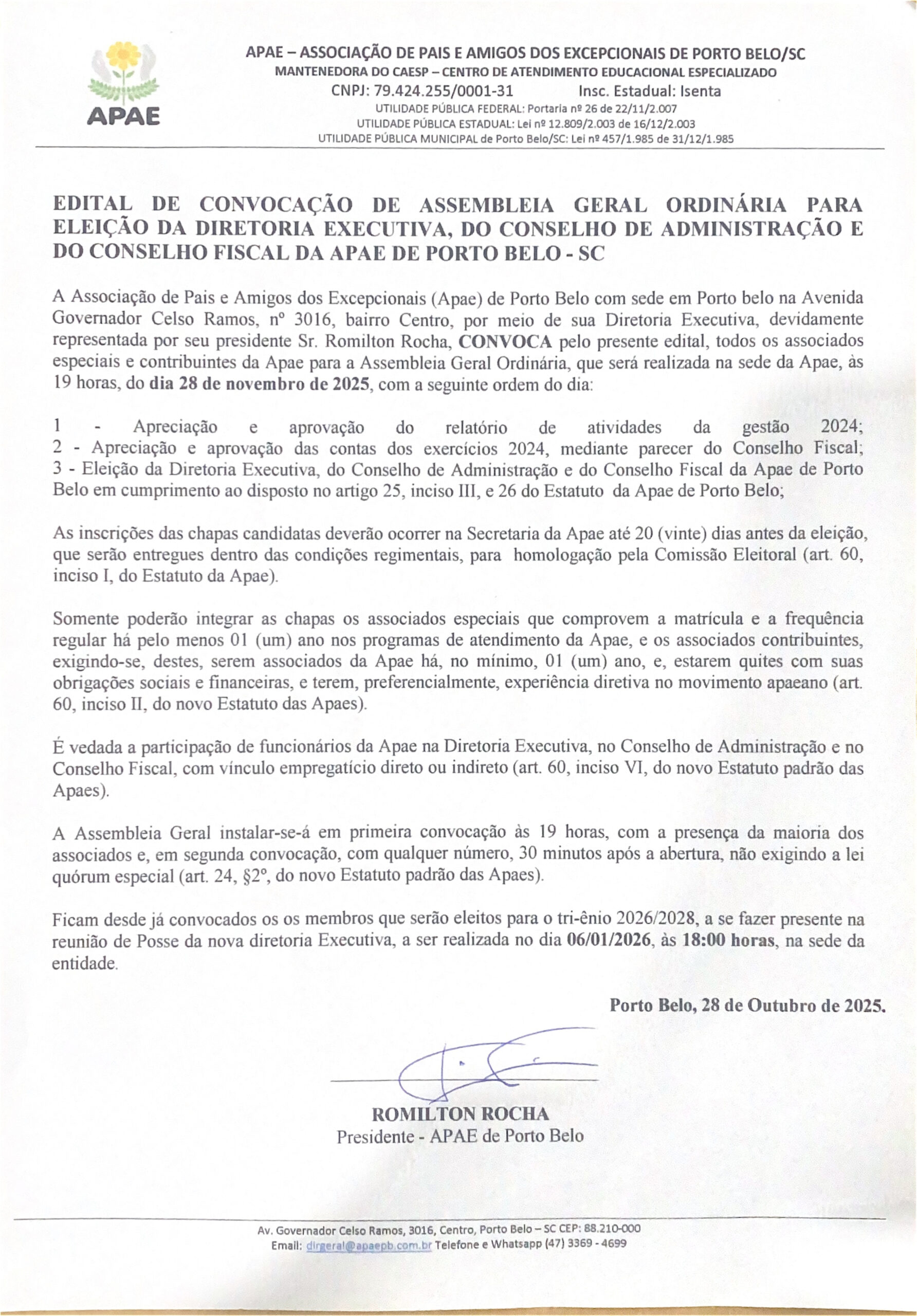 Publicações legais EDITAL DECONVOCAÇÃO DE ASSEMBLEIA GERAL ORDINARIA PAEA ELEIÇÃO DA DIRETORIA EXECUTIVA, DO CONSELHO DE ADMINISTRAÇÃO R DO CONSELHO FISCAL DA APAE DE PORTO BELO SC Outubro 29, 2025 Tags: diretoria, edital apae, eleiçao Continue Reading Previous EDITAL PLATAFORMANext EDITAL PLATAFORMA More Stories Publicações legais EDITAL PLATAFORMA Março 3, 2026 Publicações legais EDITAL PLATAFORMA Fevereiro 16, 2026 Destaques Porto Belo Publicações legais POLÍCIA CIVIL PRENDE CASAL E DESARTICULA PONTO DE TRÁFICO NO BAIRRO PEREQUÊ Fevereiro 7, 2026 Deixe um comentário Cancelar respostaO seu endereço de email não será publicado. Campos obrigatórios marcados com *Comentário * Nome * Email * Site Guardar o meu nome, email e site neste navegador para a próxima vez que eu comentar.