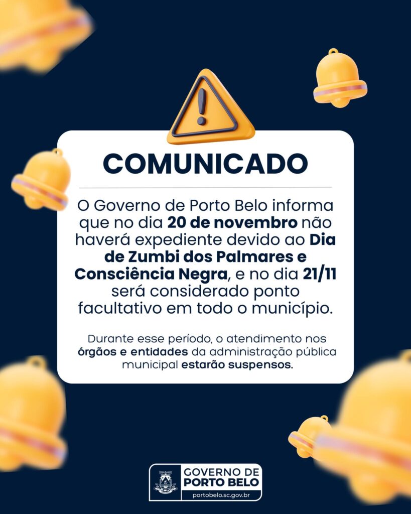 O Governo de Porto Belo informa à comunidade que, em razão do Dia de Zumbi dos Palmares e da Consciência Negra, celebrado nacionalmente no dia 20 de novembro, não haverá expediente nas repartições públicas municipais. A data, instituída pela Lei Federal nº 14.759/23, reconhece a importância histórica e cultural da luta do povo negro no Brasil, reforçando o compromisso com a valorização da igualdade racial.