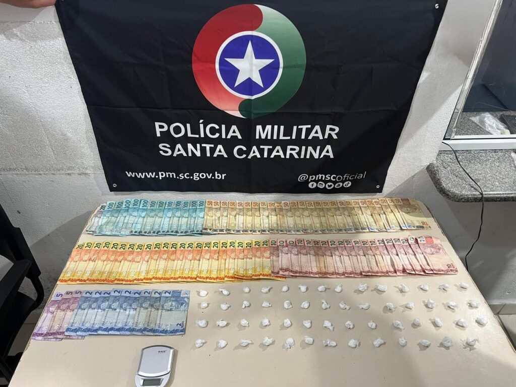 Após buscas no interior do estabelecimento, os policiais localizaram 55 buchas de cocaína escondidas em diferentes pontos, além de uma balança de precisão e a quantia de R$ 3.383,00 em dinheiro.